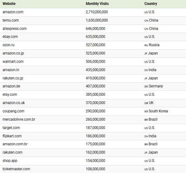 全球电商网站流量排行!亚马逊月访27亿次称霸,TEMU、速卖通杀入前三!